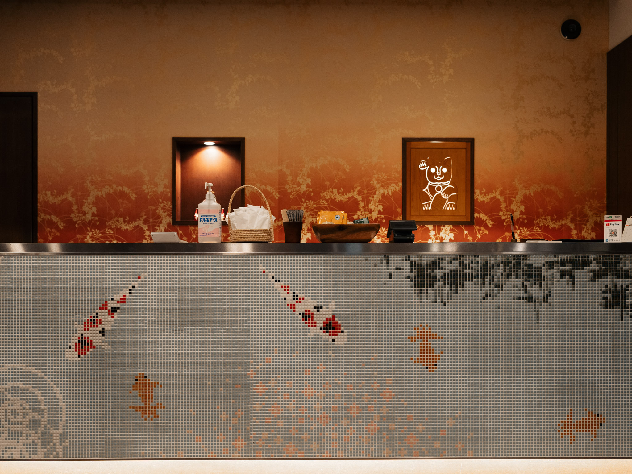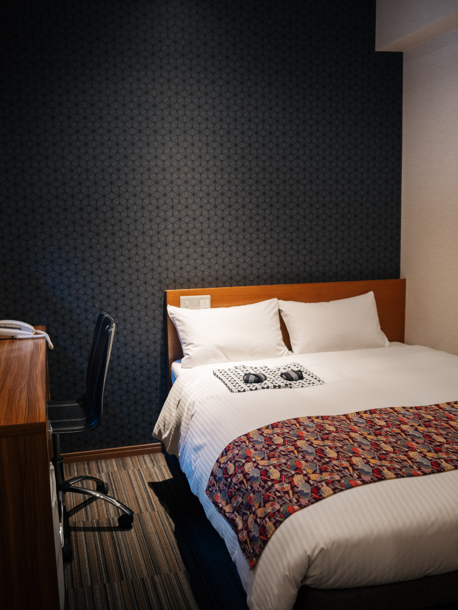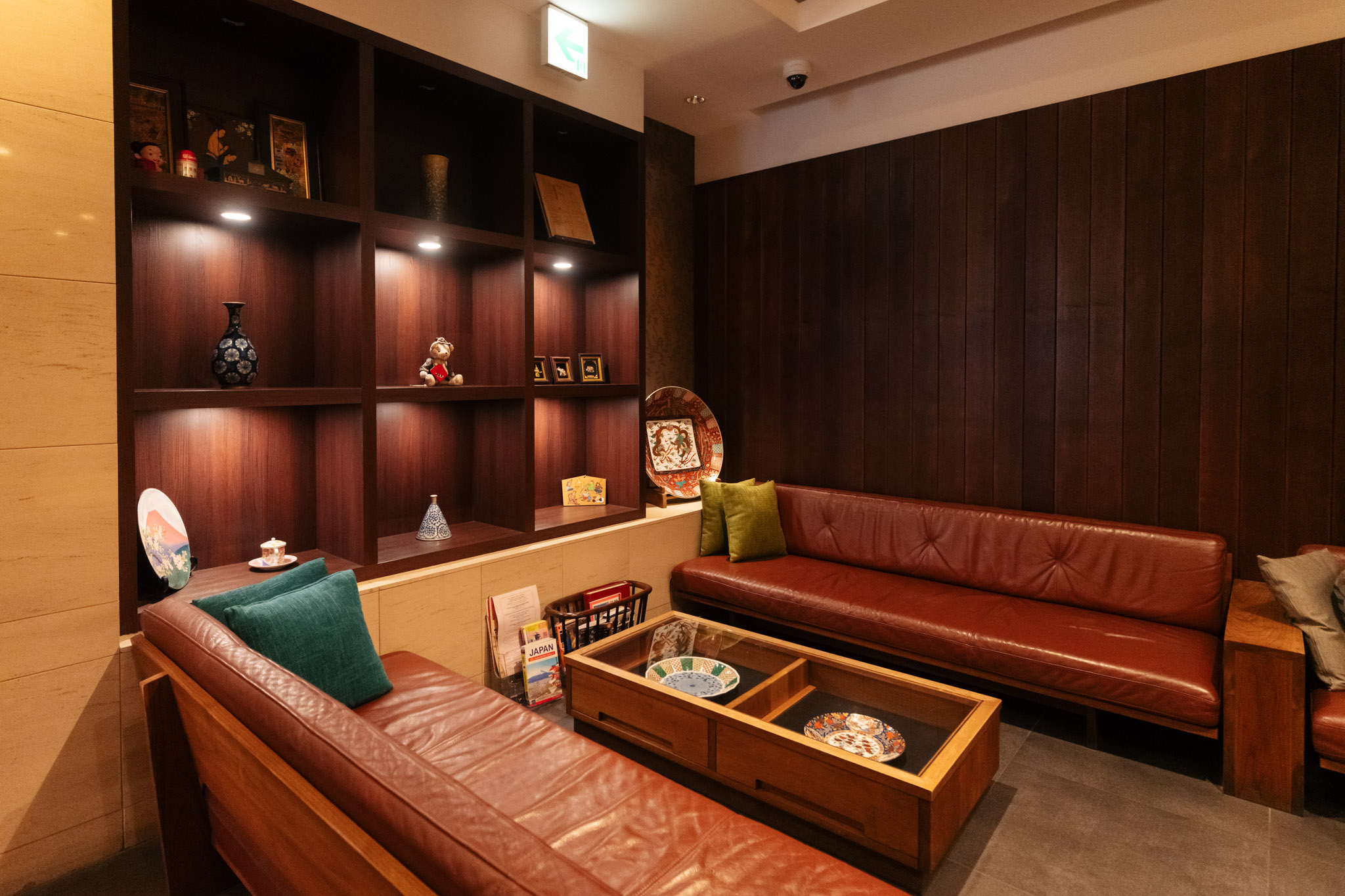 After descending the pedestrian deck directly connected to the station, a short walk will bring you to the signboard of “Tokaneya Hotel”. After entering the entrance and passing through a straight passageway, you will find yourself in a lobby with a modern Japanese style and a relaxed atmosphere. Small articles arranged on shelves, a beautifully tiled reception desk depicting Nishikigoi carp, and wallpaper used in temples and shrines in Kyoto. Just by being in the lobby, you can feel the Japanese atmosphere everywhere.