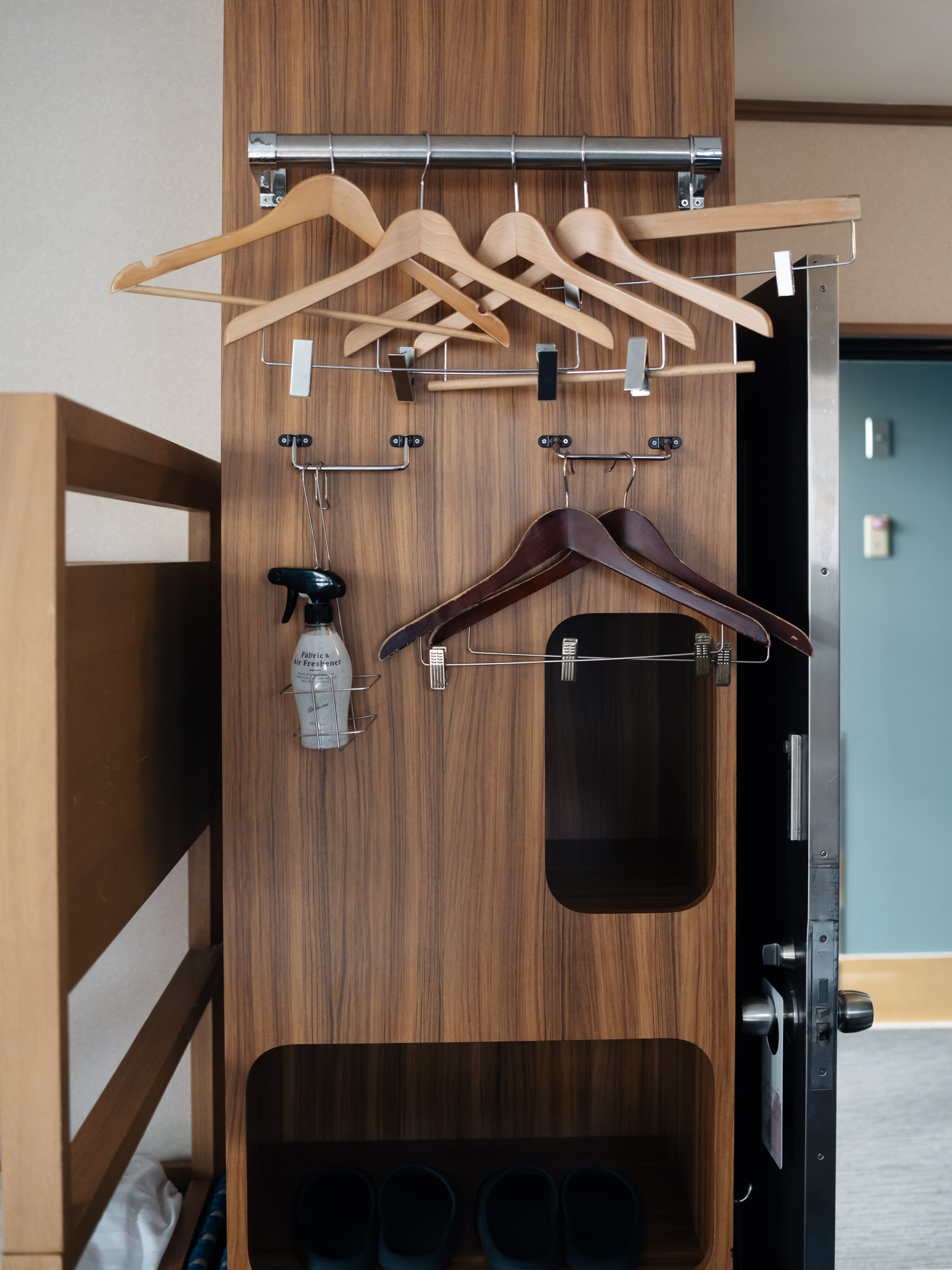 Fresh green and linen-leaf patterned wallpaper on the 5th floor. Plenty of hangers.