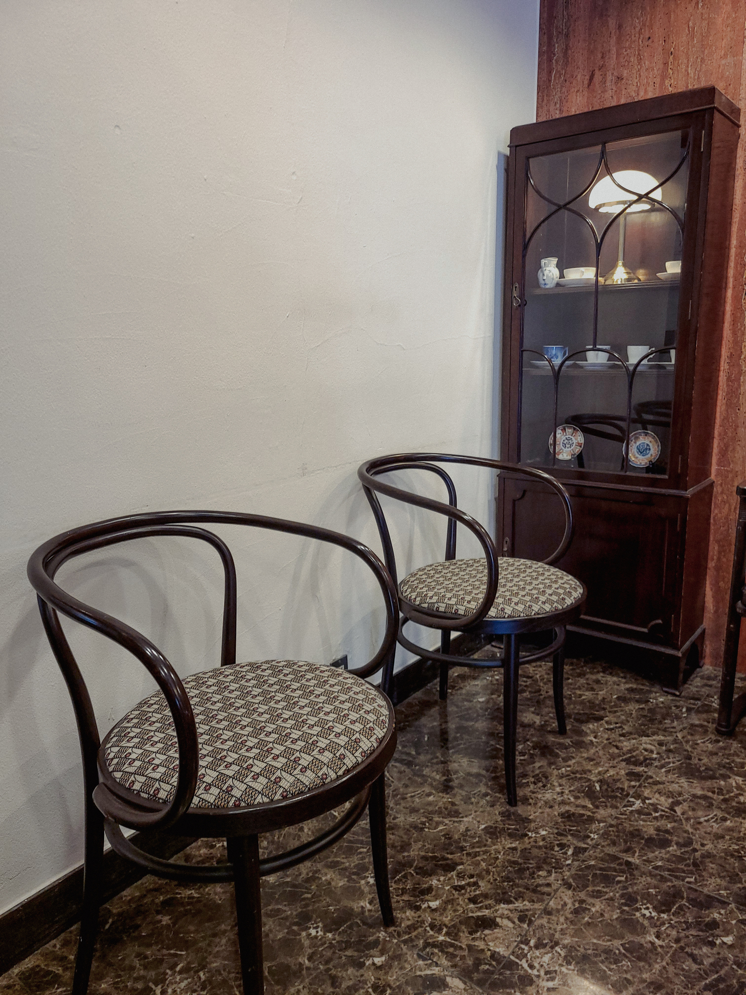 In just a few minutes’ walk from West Exit of Shinjuku Station, I arrive at the simple-looking entrance of Kadoya Hotel. This 87-room hotel has a simple interior with wooden walls, a marble floor, a chandelier, and lit up check-in counter with a black-and-white photo displayed on the monitor behind it. I look to my left and see a few vintage chairs and a glass case with some cups and plates on display, making for a very Showa-retro feel.