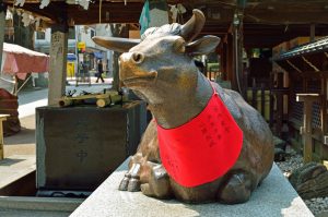 The Nadeushi, or “stroking cow,” is a stone statue of a cow found within the shrine grounds. Cows are considered sacred in Tenmangu shrines because Sugawara no Michizane was born in the Year of the Ox (845).